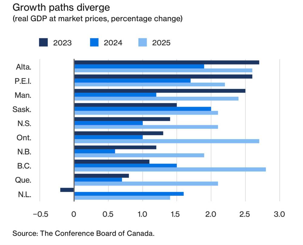 After this year’s 2.5 per cent growth rate in Manitoba, the Conference Board is forecasting 1.3 per cent in 2024 and 2.5 per cent in 2025, which would still be near the top among the provinces.