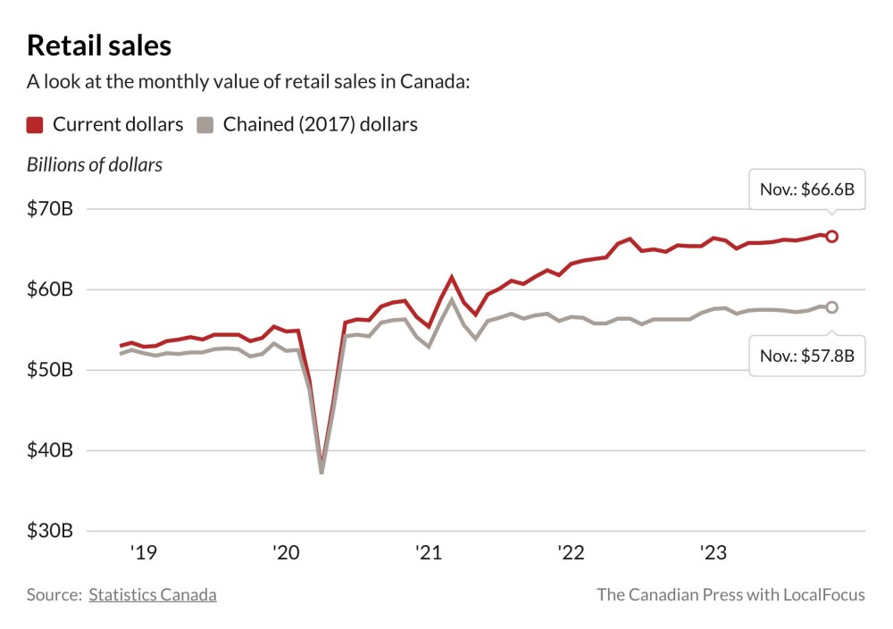 The data released by Statistics Canada on Friday revealed November’s retail sales amounted to $66.6 billion, lower than many economists had expected.