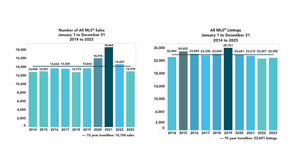 The WRREB clocked 12,978 home sales in 2023, an 11 per cent decline from the prior year. Over the past decade, six years have had more home sales in Winnipeg than 2023.