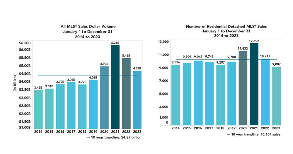 The overall dollar volume — $4.6 billion — as dropped year-over-year by 14 per cent. Still, 2023 ranked fourth for highest dollar volume sales in the WRREB history.