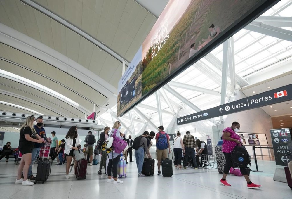 The union representing striking airline catering workers says provincial mediators have called them back to the bargaining table with employer Gate Gourmet. People line up before entering the security at Pearson International Airport in Toronto, Friday, Aug. 5, 2022. THE CANADIAN PRESS/Nathan Denette