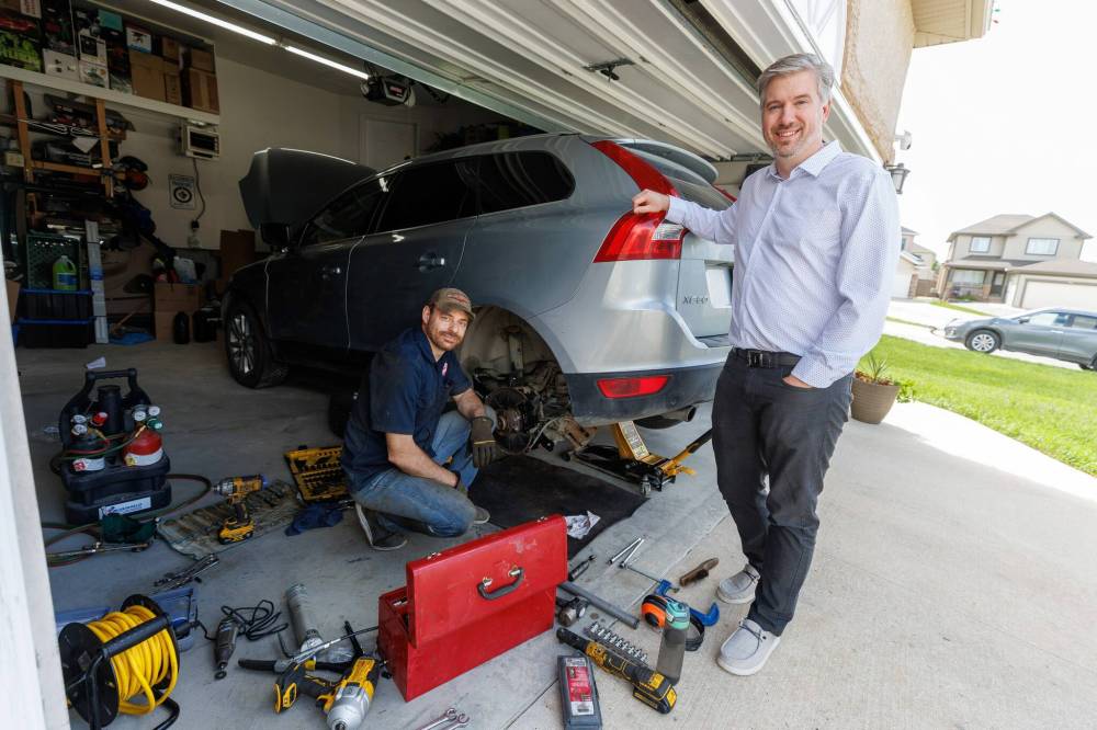 MIKE DEAL / FREE PRESS Yvan Boisjoli (right) one of the founders of Bold Commerce has a new a startup called Peazy, an online marketplace for mobile service providers where individuals and businesses can book services to come to your home or place of business. At left is Jaeson Wheeler, an auto technician who uses the platform to book appointments.