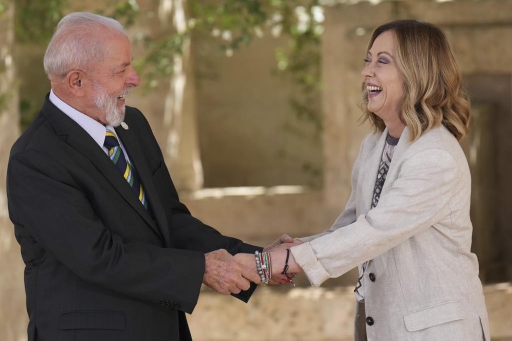 Luiz Inácio Lula da Silva, President of Brazil, left, shares a light moment with Italy's Prime Minister Giorgia Meloni as he is welcomed on day two of the 50th G7 summit at Borgo Egnazia, southern Italy, on Friday, June 14, 2024. (Christopher Furlong/Pool Photo via AP)