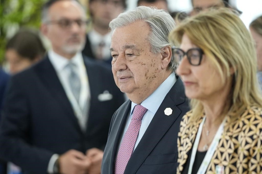 U.N. Secretary-General António Guterres arrives for a working session on AI, Energy, Africa and Mideast, at the G7, Friday, June 14, 2024, in Borgo Egnazia, near Bari, southern Italy. (AP Photo/Alex Brandon)