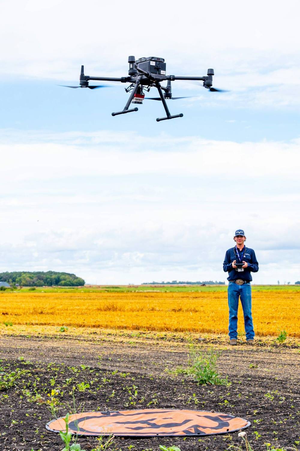 Milt Olfert is also a drone convert. On one occasion last year, when his land was too wet for heavy equipment, he turned to his drone to seed 250 acres of canola. It’s a simple process: He inputs seed, sets parameters on an app and directs it to start its mission; once its power source runs low, it returns for a battery change.