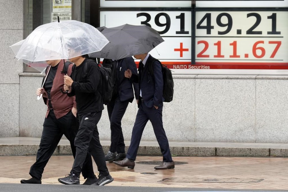 People walk in front of an electronic stock board showing Japan's Nikkei index at a securities firm, Wednesday, Oct. 9, 2024, in Tokyo. (AP Photo/Eugene Hoshiko)