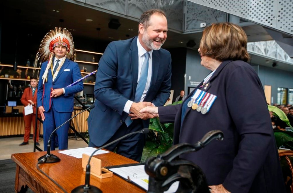 The Manitoba government is looking to tighten the rules around the sale of machetes, swords and other long-bladed weapons. Manitoba Premier Wab Kinew looks on as Matt Wiebe, Minister of Justice and Attorney General, Keeper of the Great Seal of the Province of Manitoba, Minister responsible for the Manitoba Public Insurance Corporation is sworn-in by Lt. Gov. Anita Neville in Winnipeg, Wednesday, Oct. 18, 2023. THE CANADIAN PRESS/John Woods