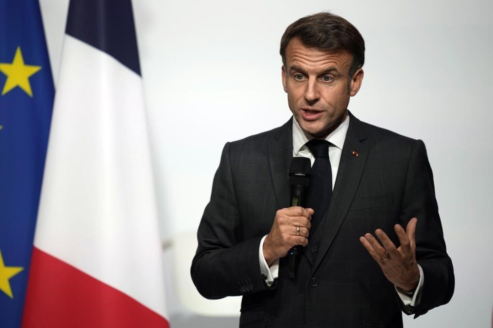 FILE - French President Emmanuel Macron delivers a speech after inaugurating the Fabriqué en France (Made in France) exhibition at the Elysee Palace in Paris, Friday, Oct. 25, 2024. (AP Photo/Louise Delmotte, Pool, File)