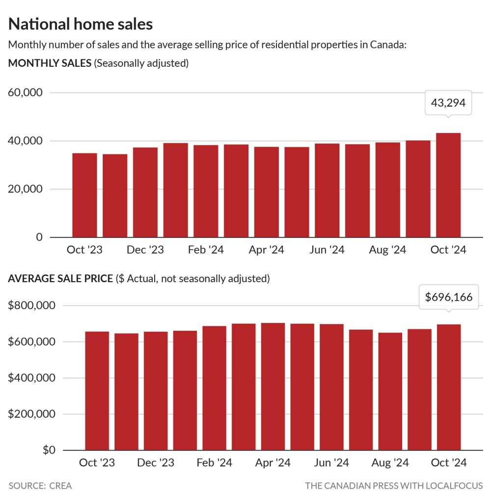 On a seasonally adjusted month-over-month basis, national home sales rose 7.7 per cent from September, as 44,041 residential properties changed hands last month across Canada.