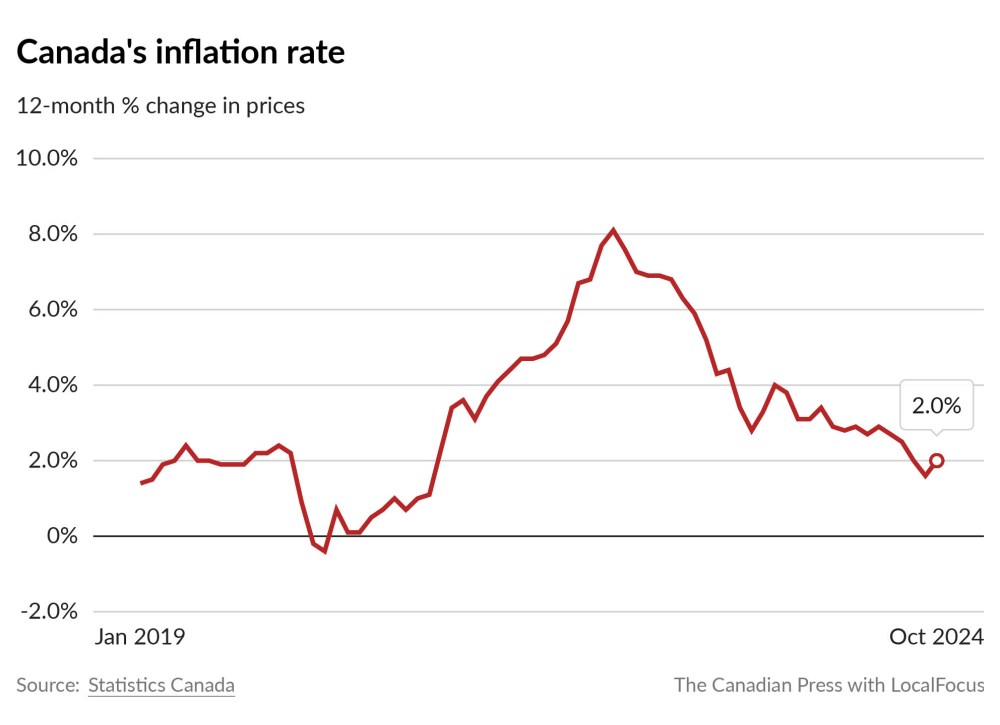 OTTAWA – Canada’s inflation rate climbed back up to two per cent in October, shifting expectations slightly in favour of a smaller, quarter-percentage point interest rate cut next month.