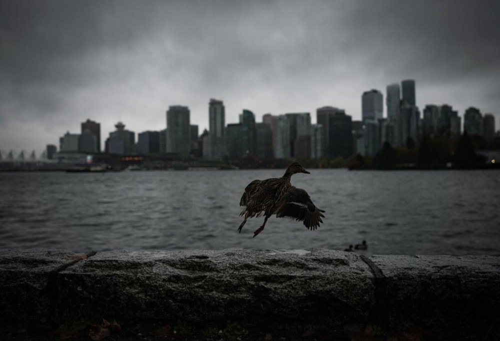 A duck flies off the Stanley Park seawall while heavy rain falls as the downtown Vancouver skyline is seen across the water, on Saturday, Oct. 19, 2024. THE CANADIAN PRESS/Darryl Dyck