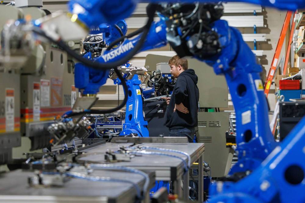 Joel Vanderveen, mechanical engineering technologist, programs a robot.