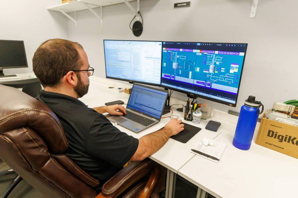 Ryan Bryson, electrical technician, works on a panel assembly.