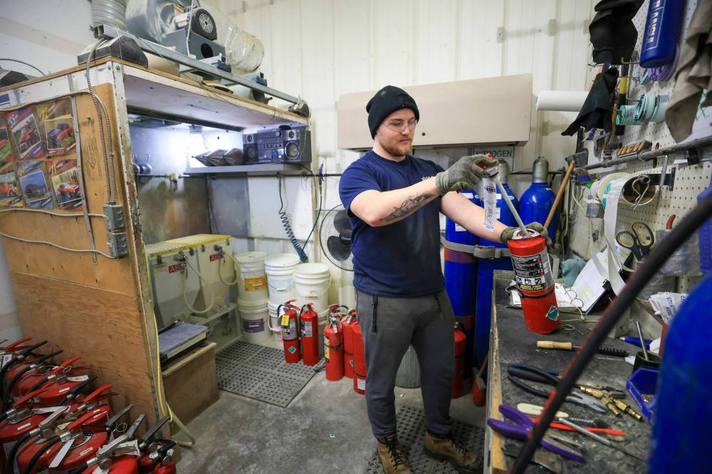 Shop tech Caynen Kwiatek at work in the ‘powder room’ where Bison Fire Protection employees refill/recharge fire extinguishers.