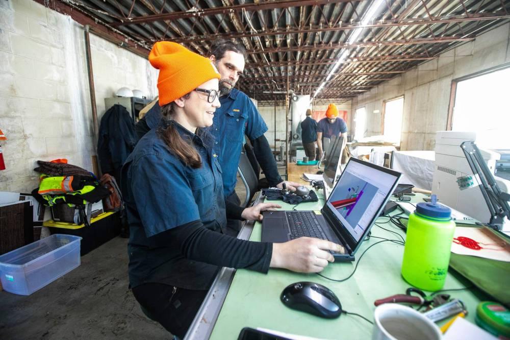 MIKAELA MACKENZIE / FREE PRESS Benita Kliewer (front) and Hargraves look at digital plans for a chainsaw ice-cutting rig at Anvil Tree workshop in St. Vital on Tuesday.
