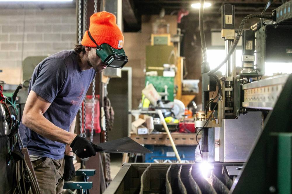 MIKAELA MACKENZIE / FREE PRESS Fabrication Lead Tom Kroeker uses a cnc plasma cutter to create a piece for a custom skid steer attachment.