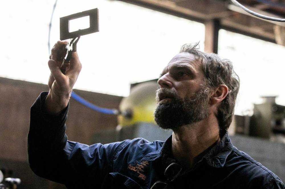 MIKAELA MACKENZIE / FREE PRESS Anvil Tree co-owner Peter Hargraves takes a look at a piece for a custom skid steer attachment.