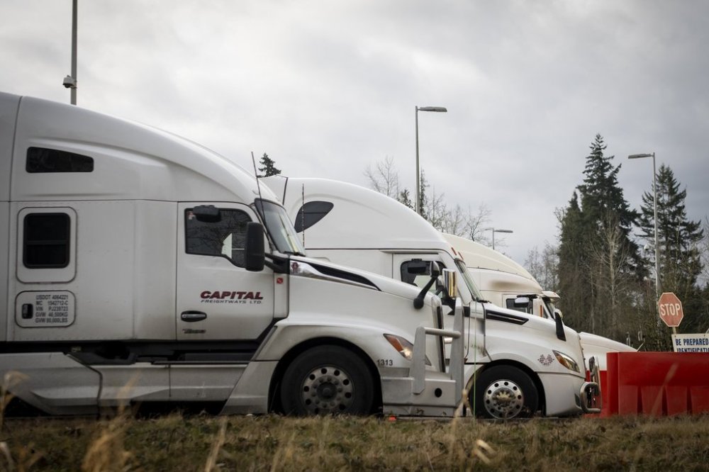 Trucks wait at the United States and Canada border in Surrey B.C., on Tuesday, March 4, 2025. THE CANADIAN PRESS/Ethan Cairns