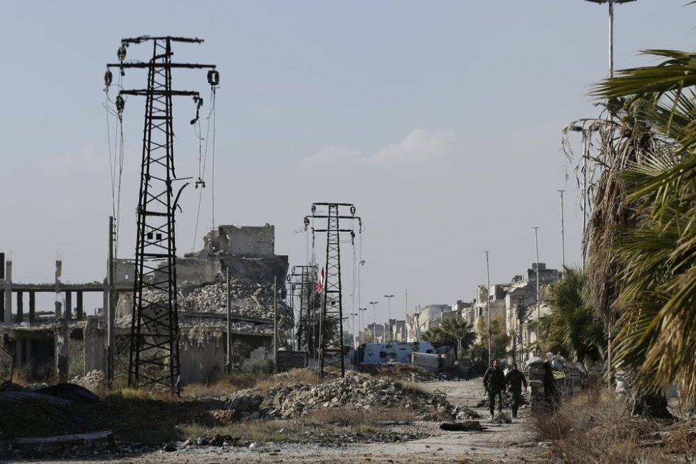 FILE - Syrian army soldiers walk next to damaged electricity transmission towers on their way back from the frontline of fighting, in Karam al-Tarab neighborhood of Aleppo, Syria, Dec. 4, 2016. (AP Photo/Hassan Ammar, File)