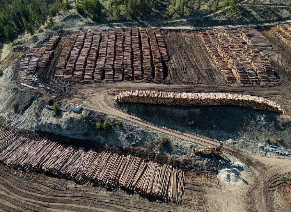 In an aerial view, logs are seen stacked at Gorman Brothers Lumber sawmill, in West Kelowna, B.C., on Friday, April 4, 2025. THE CANADIAN PRESS/Darryl Dyck