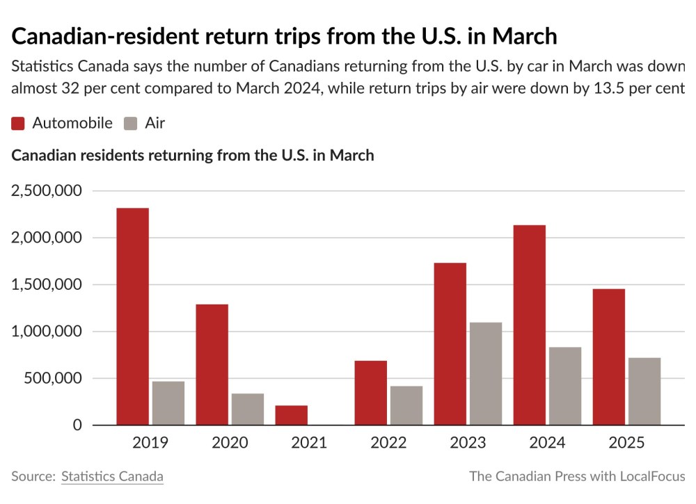 In March, the number of Canadians returning home by car from the U.S. fell nearly 32 per cent compared to March 2024, the third consecutive month of year-over-year declines and the steepest plunge since the pandemic, according to Statistics Canada.