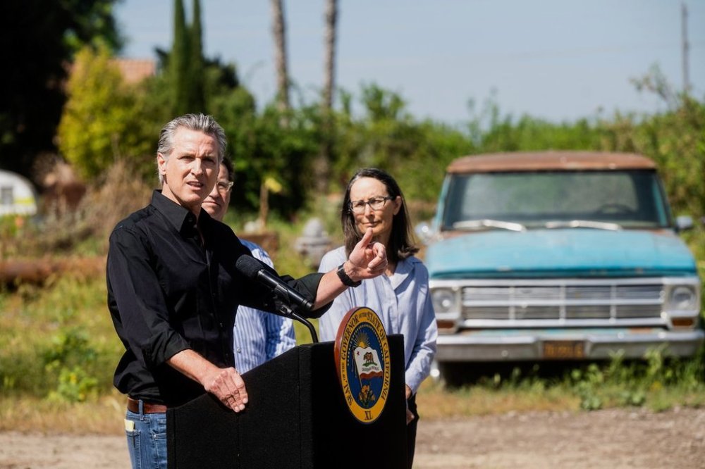 Newsom discussed the lawsuit at an orchard in the farm-rich Central Valley, highlighting California’s status as a farming powerhouse. Many of the nuts, fruits and vegetables grown in the state are destined for other countries.