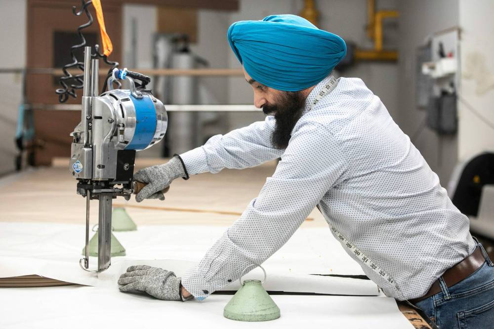 Inderjit Jassal cuts fabric at GarmaTech. Ediger and her seven employees do design work, pattern making and manufacturing for a range of brands.