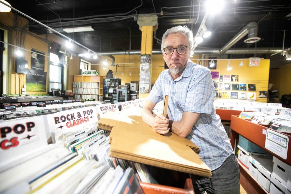 Into the Music president Greg Tonn with postal packaging materials currently going unused at the Winnipeg store.