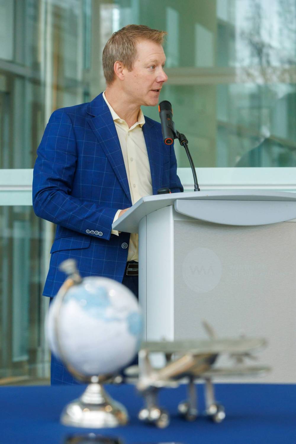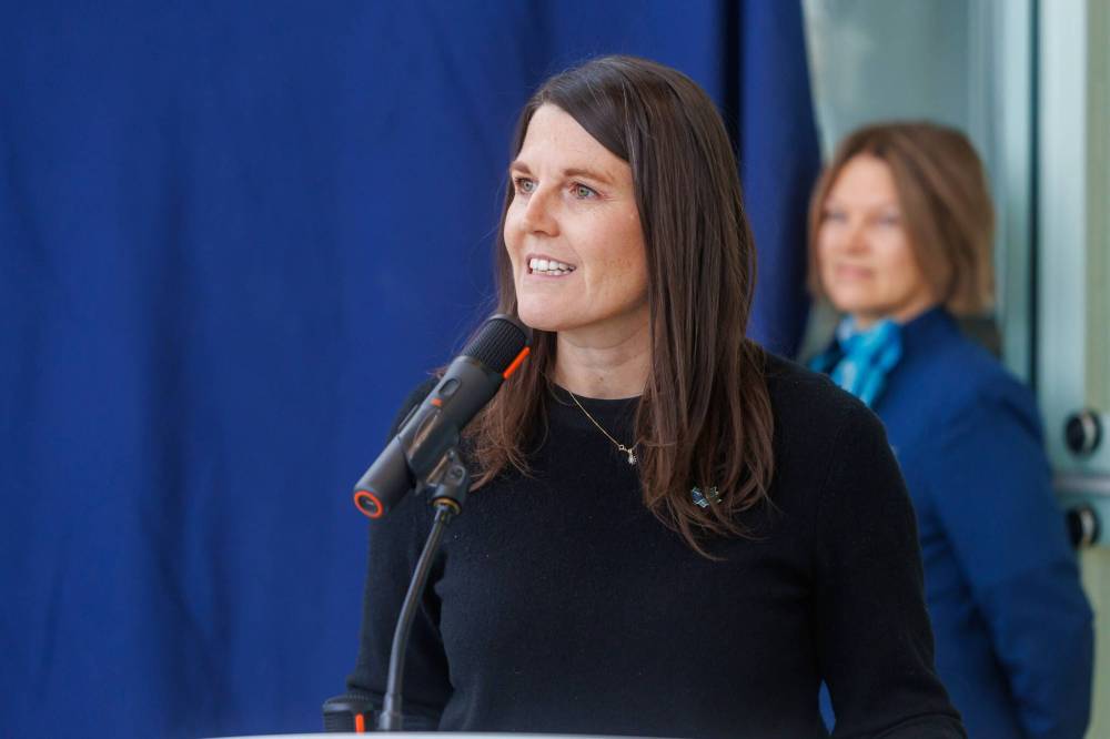 April Crane, vice president of communications and engagement for WestJet, speaks during Tuesday’s announcement.