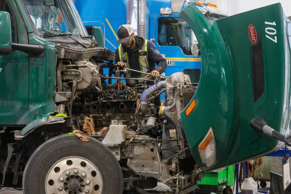 MIKE DEAL / FREE PRESS Peterbilt Manitoba Ltd. at 1895 Brookside Blvd. Colin Pitzel, Service Technician, works on an engine. Reporter: Aaron Epp 251126 - Wednesday, November 26, 2025.