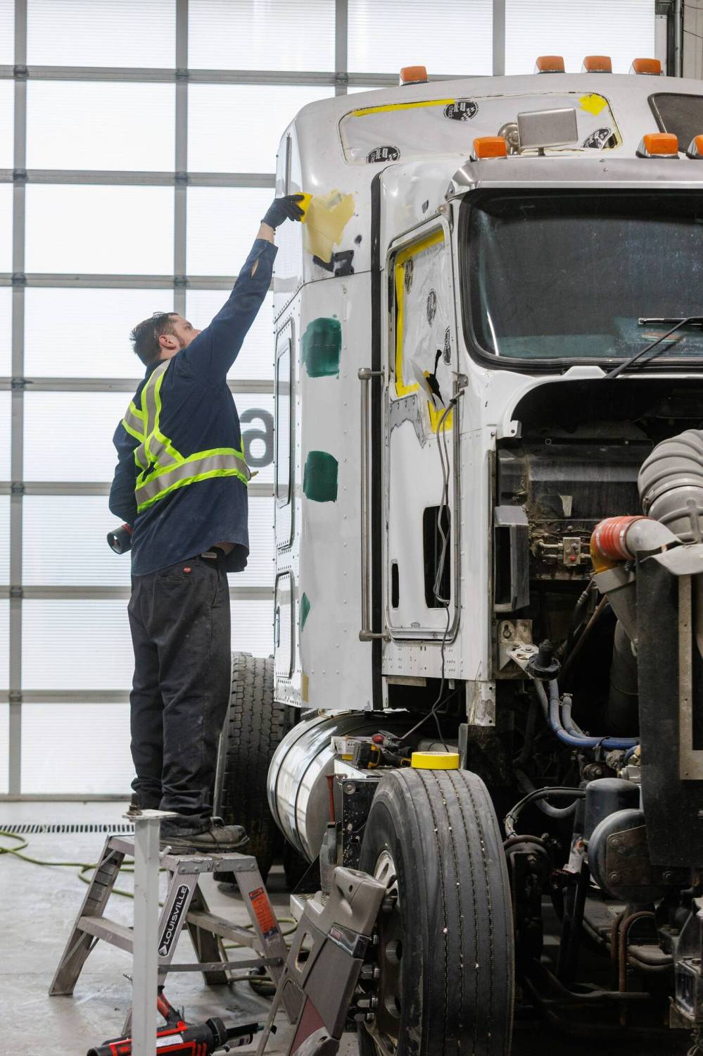 MIKE DEAL / FREE PRESS Peterbilt Manitoba Ltd. at 1895 Brookside Blvd. Arvinder Singh, Body Shop Technician working on a damaged truck. Reporter: Aaron Epp 251126 - Wednesday, November 26, 2025.