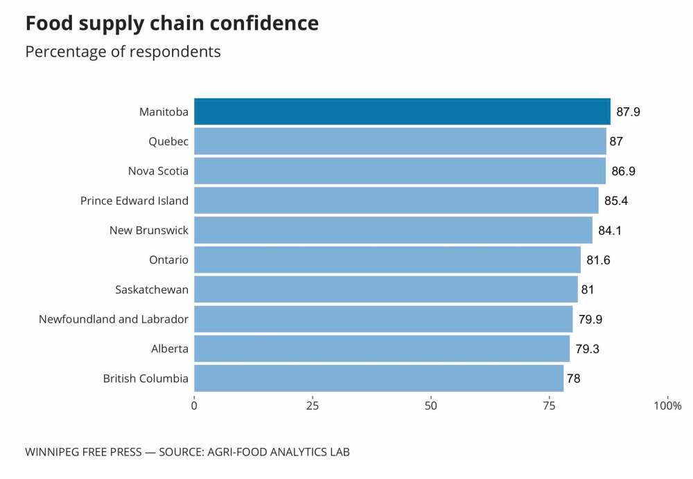 And trends in the study, which surveyed over 10,000 people from coast to coast, show that Manitoba leads other provinces in confidence rates about major aspects like food safety and supply chains.