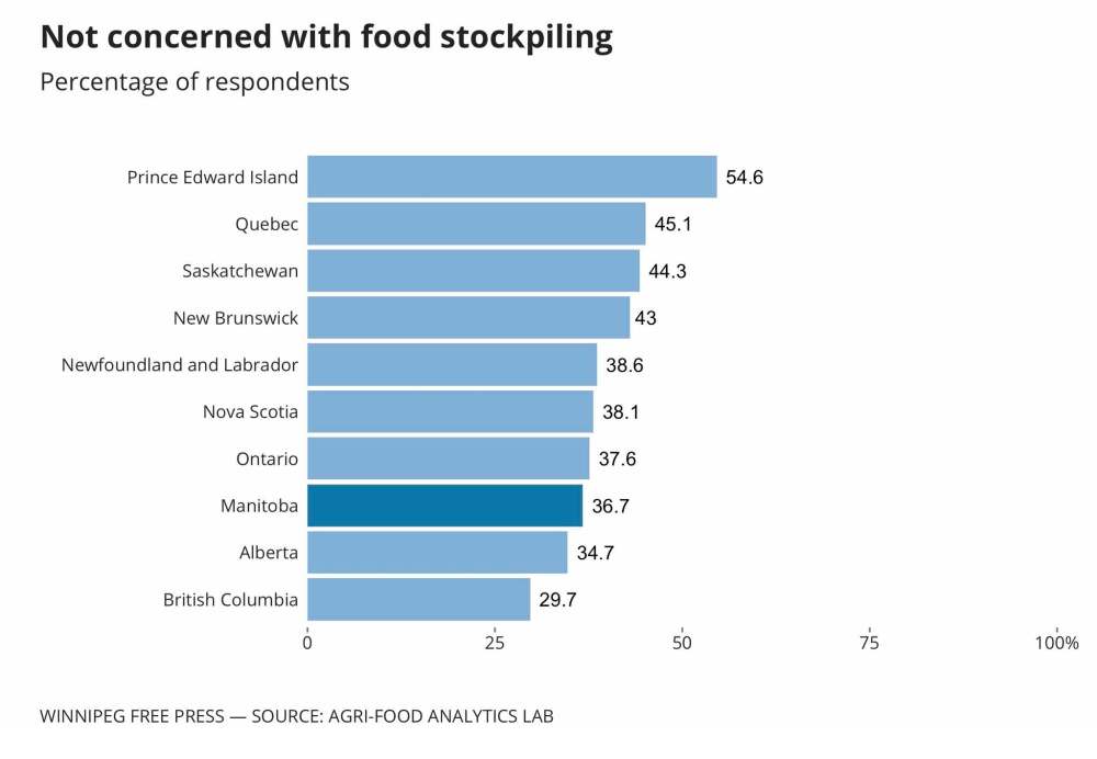 When asked if they believe people will not stockpile food due to the COVID-19 pandemic, only 38.4 per cent respondents agreed nationally. In Manitoba, that’s 36.7 per cent, which is among the lowest of concerned provinces, with the most concerned region being Prince Edward Island, at 54.6 per cent.