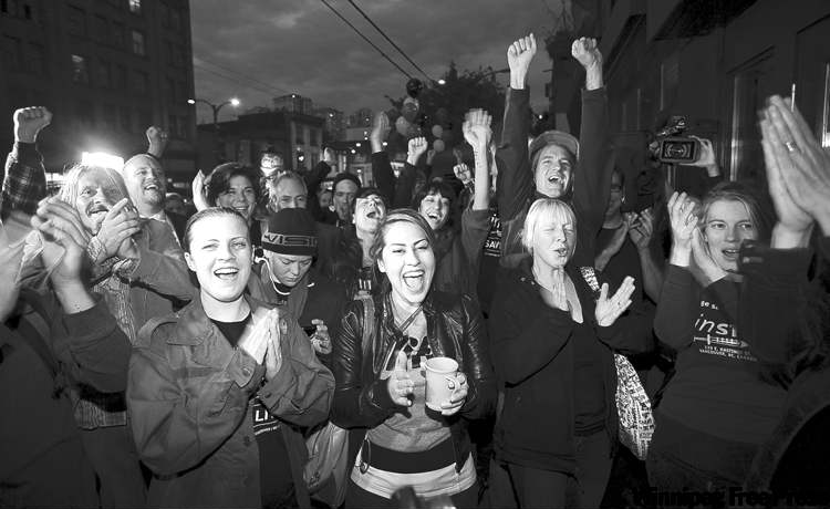 CP Supporters of Insite celebrate outside the facility in Vancouver after the Supreme Court of Canada announced that it would allow the safe injection site to stay open Friday, Sept. 30, 2011. Insite, located in Vancouver downtown Eastside is a safe drug injection site where addicts are supervised as they do injection style drugs preventing the spread of disease and risk of overdose. THE CANADIAN PRESS/Jonathan Hayward
