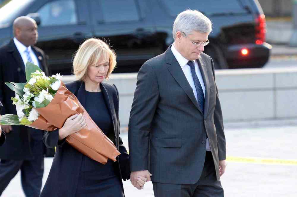 Updated on Thursday, October 23, 2014 10:15 AM CDT: Updates with Harper and wife visiting memorial, adds info about Centre Block