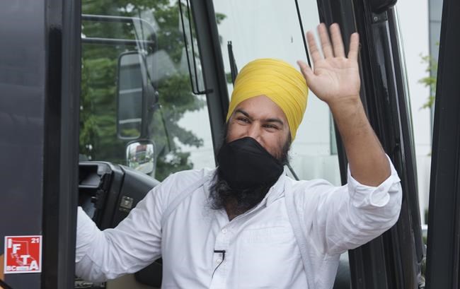 NDP Leader Jagmeet Singh waves as he boards his campaign bus in Coquitlam, B.C.,, on Tuesday, August 17, 2021. THE CANADIAN PRESS/Paul Chiasson