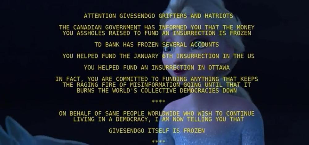 The unidentified hackers also took over GiveSendGo website, redirecting visitors to another website that featured an anti-protest manifesto scrolling over a scene from Disney’s “Frozen.”