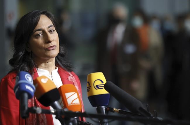 Canadian Defence Minister Anita Anand speaks with the media as she arrives for a meeting of NATO defense ministers at NATO headquarters in Brussels, Wednesday, Feb. 16, 2022. Anand says the Canadian military is weighing its capacity to send reinforcements to bolster NATO's eastern flank given its numerous other commitments in at home and around the world. THE CANADIAN PRESS/AP-Olivier Matthys