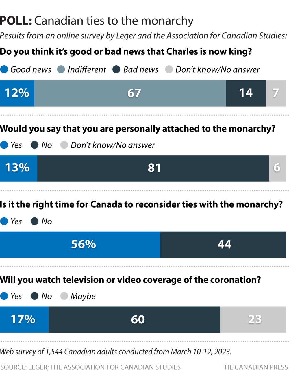 The web survey of 1,544 adults released Tuesday by market research firm Leger indicates many Canadians are greeting the ascension of Charles to the throne with a shrug.