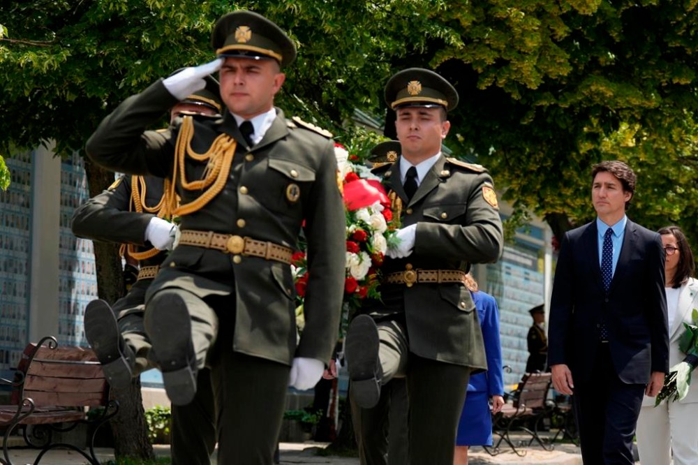 On his way to the wall, Trudeau at one point crouched down low to look inside one of the frames of burnt-out Russian tanks and military vehicles that fill a public square. Not long before Trudeau and Freeland arrived, there was sombre music and an honour guard for a casket carried into the cathedral for a funeral.