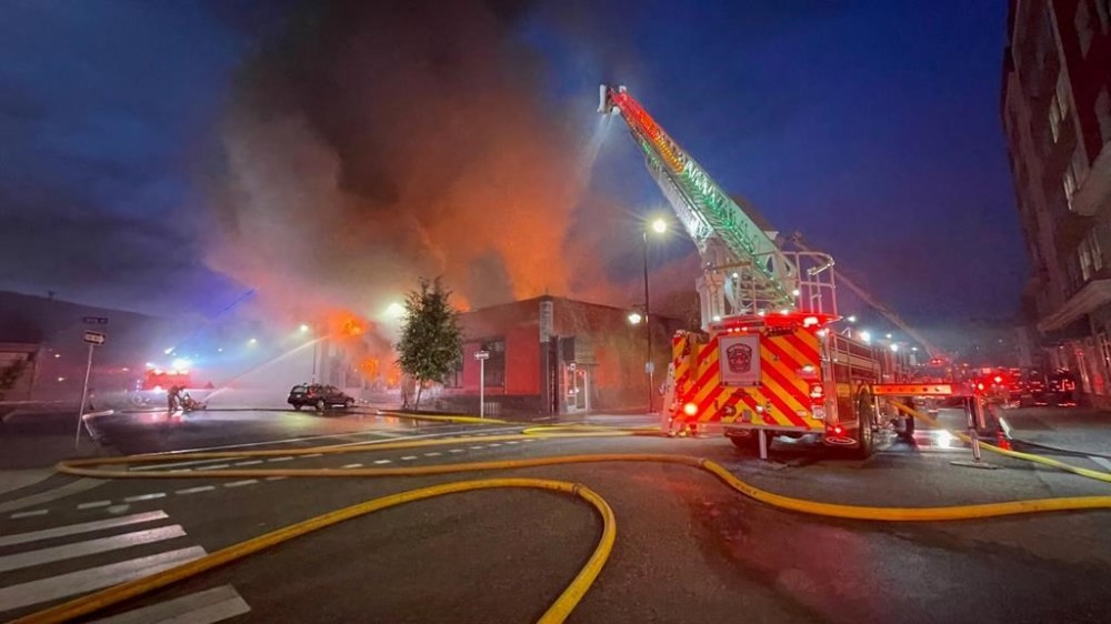 Flames broke out in the commercial building at about 2:30 a.m., blanketing the downtown core of the north Okanagan city with thick smoke.
