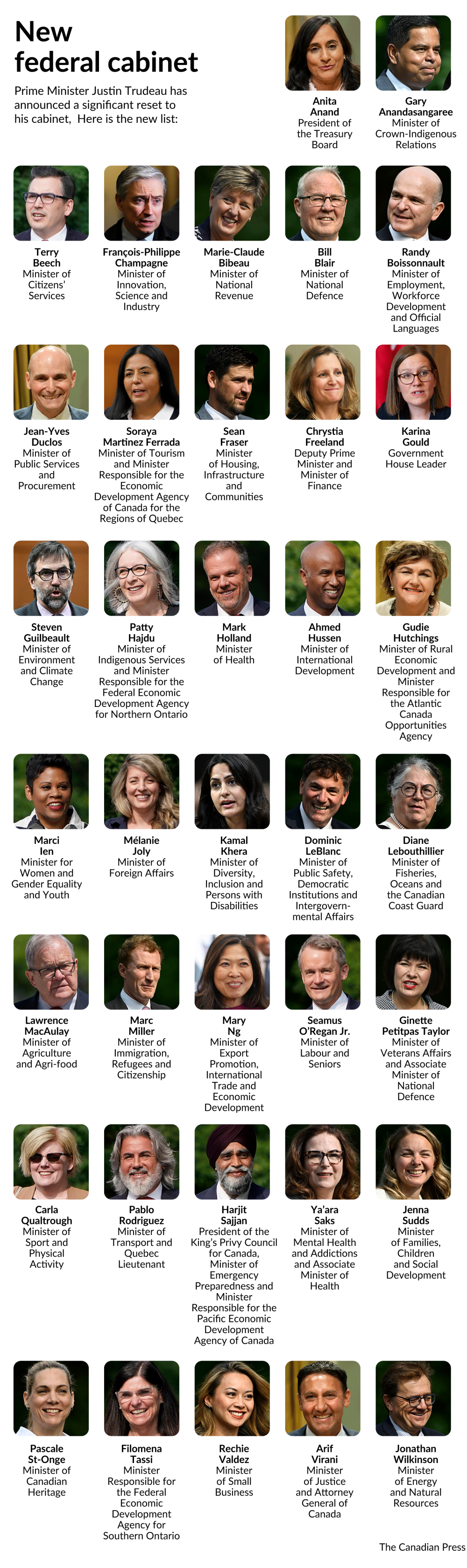OTTAWA – Prime Minister Justin Trudeau has announced a massive overhaul to his cabinet two years into his latest mandate, with about three-quarters of cabinet portfolios switching hands.
