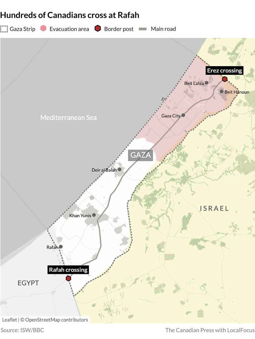 The Egyptian government is allowing those who cross the Rafah border to stay in the country for up to 72 hours. The Canadian Embassy in Egypt is assisting those who cross with transportation to Cairo, as well as with food and accommodation until they arrange their travel plans.