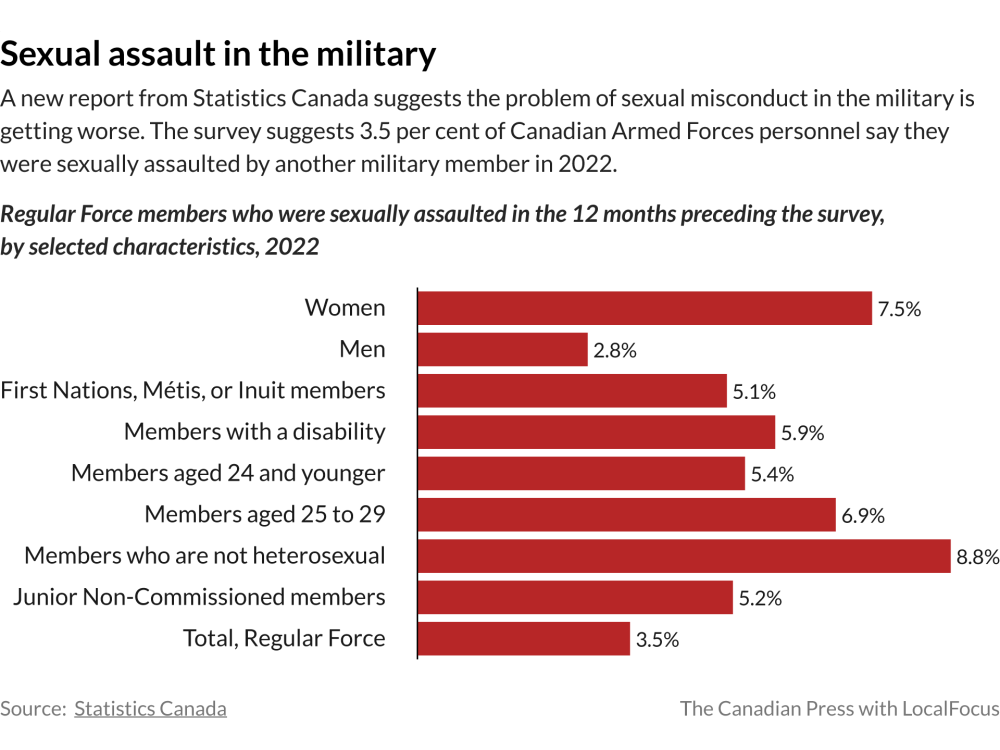 StatCan released the report Tuesday based on its 2022 survey of Armed Forces members, which examined the prevalence of sexual misconduct and sexual assault in the military workplace or outside work involving another military member.