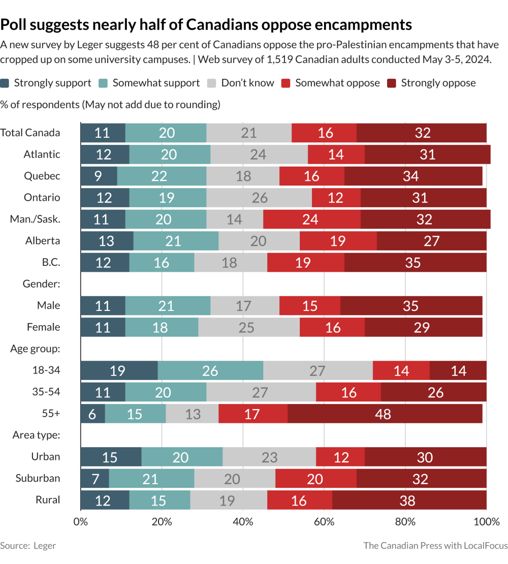 OTTAWA – A new opinion poll suggests nearly half of Canadians oppose the pro-Palestinian encampments that have cropped up on some university campuses.