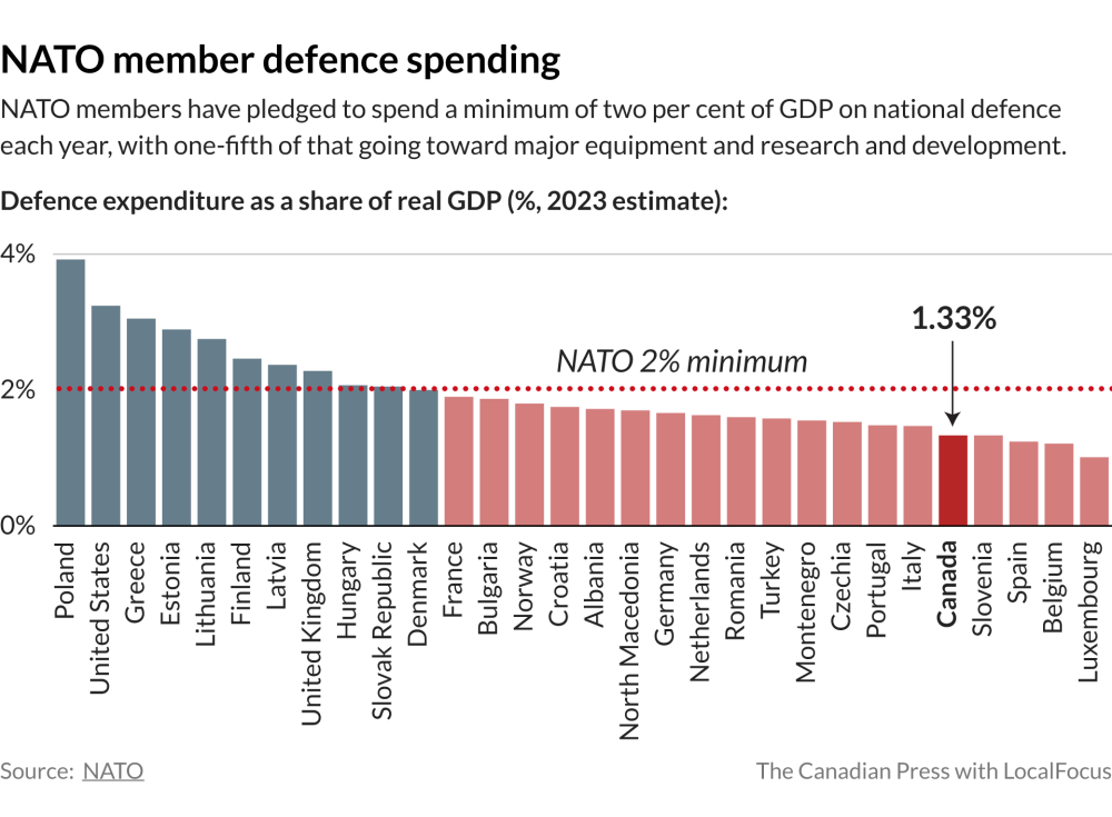 Still Canada is falling far shy of the target NATO countries agreed to about a decade ago. That is to spend at least the equivalent of two per cent of their national gross domestic product on defence. Canada’s current spend is almost 1.4 per cent.