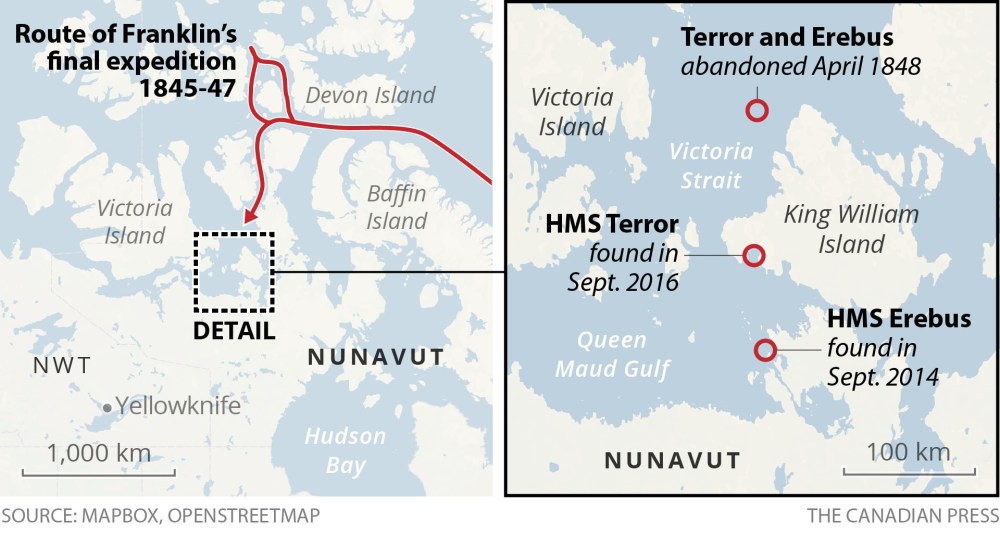 Franklin’s ships, HMS Erebus and Terror, set out from England in 1845 in search of the Northwest Passage. The commander and his 128 men never returned.