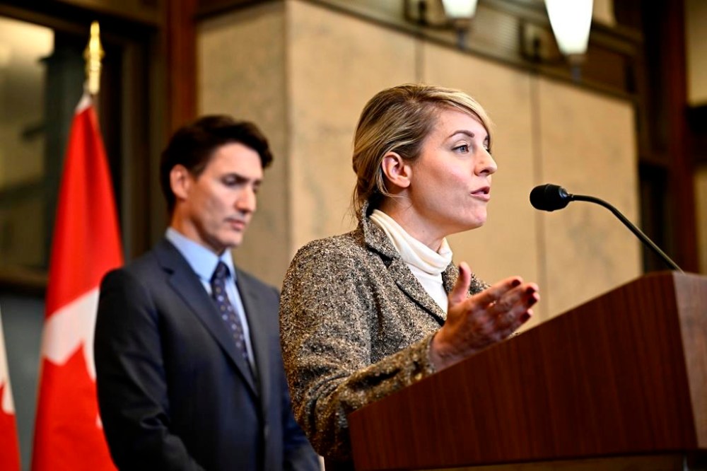 Minister of Foreign Affairs Melanie Joly speaks as Prime Minister Justin Trudeau listens during a news conference on Parliament Hill in Ottawa, on Monday, Oct. 14, 2024. Advocates want Joly to call an impartial investigation into the death of a Canadian woman the federal government refused to repatriate from a Syrian detention camp.THE CANADIAN PRESS/Justin Tang