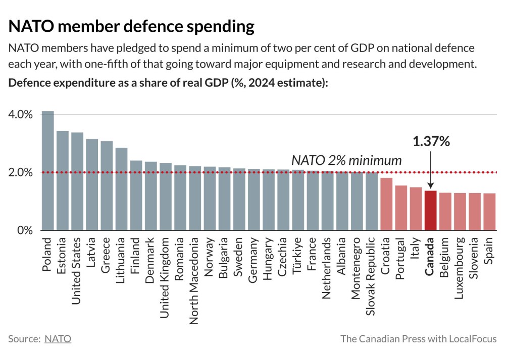 Canada consistently ranks at the back of the pack among NATO allies when it comes to how much it shells out on its military as a share of its GDP.