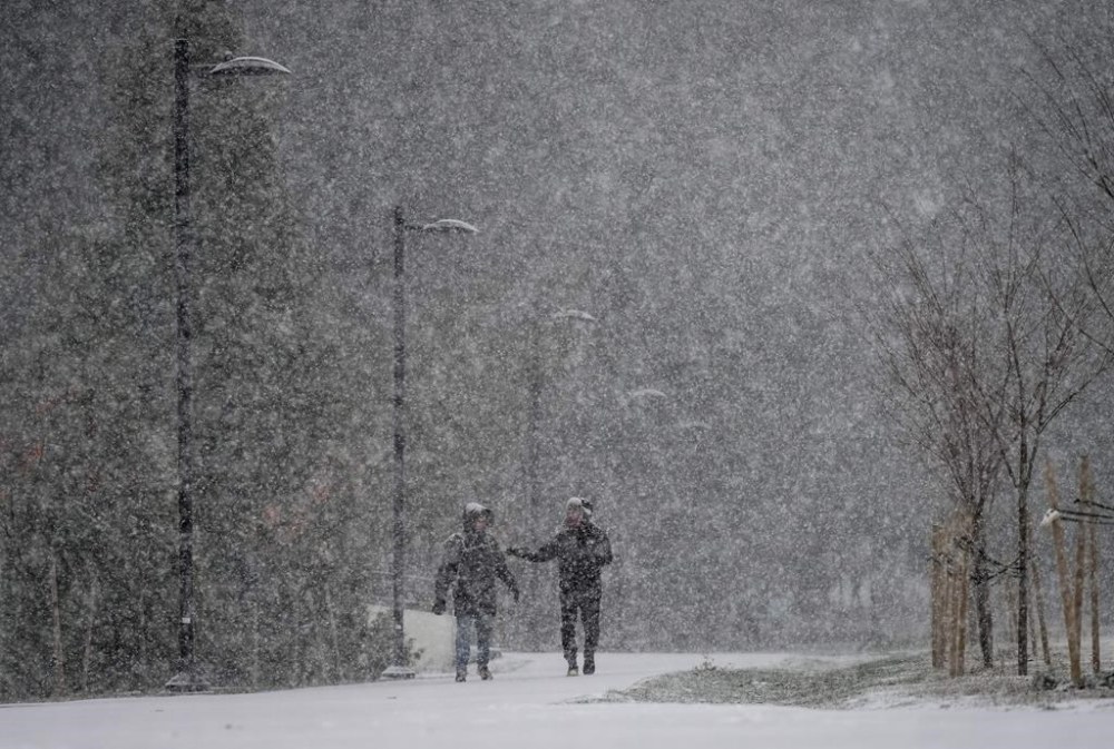 A major storm bringing snowfall amounts of up to 50 centimetres in some locations followed by freezing rain Monday is forecast to hit much of British Columbia's central and northwest regions. Heavy snow falls as pedestrians walk through Central Park in Burnaby, B.C., on Tuesday, November 29, 2022. THE CANADIAN PRESS/Darryl Dyck